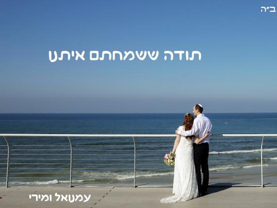 אני ומירי הכרנו דרך האתר והתחתנו ביום שישי שעבר על החוף בתל אביב. גרנו במרחק של מאה מטר אבל כמעט שלא היה סיכוי שנפגש בלעדיכם. רצינו להודות לכם שוב ולתת עוד תקווה לרווקים שעדיין מחפשים.